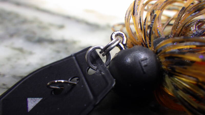 Schritt 2, der Sprengring wird an den Jig montiert. Montiert zuerst den Sprengring an den Jighead und dann erst das Blade, so habt ihr weniger Gefummel weil das Blade bei dieser Arbeit sehr störend sein kann. Extra Tipp, wenn ihr Jigheads habt die die Öse in Achsenrichtung haben, nehmt einfach 2 Sprengringe (schaue das Detail-Foto), der zweite Sprengring hat keinen Einfluss auf den Lauf des Blades, im Gegenteil sie laufen beinahe noch besser.